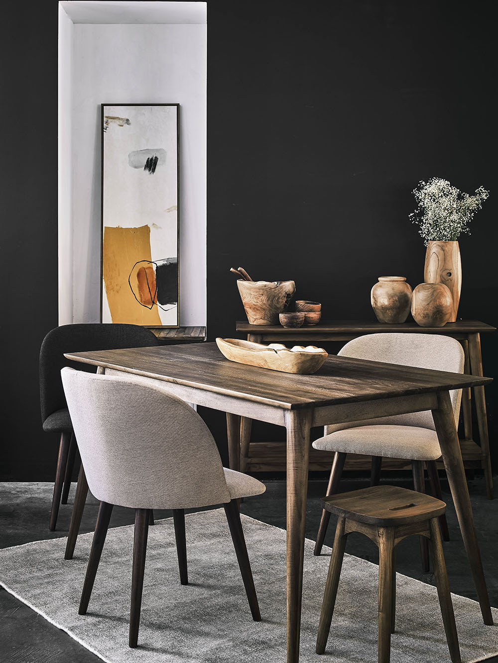 Gone are the days when you had to buy matching dining sets. Mixing different furniture styles can add character, visual interest, and give way to a one-of-a-kind look that is individual to your personal style. With so many options available, it can feel overwhelming knowing which chair styles will work together. We like to recommend finding a common thread such as colour or material between your selected seats, which will ensure that your dining setting looks cohesive and thoughtfully put together. For example, you could match a solid wood table with dining chairs with the same upholstery fabric but in varying neutral tones, or pair your dining table with a variety of reclaimed teak chairs which vary in silhouettes.